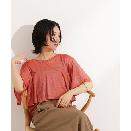 袖と胸元にフレアをあしらったデザイン性の高いカットソー。フレアによって二の腕や胸元をさりげなくカバーします。華やかなラメ糸を使ったカラーが、カジュアルなコーディネートと相性バツグンなアイテムです。<素材>華やかなラメ糸を使ったカットソー素材を使用しています。<詳細>仕様・開閉なし裏地・なし透け感・ややあり / 光沢・あり / 伸縮性・あり 生地の厚さ・薄手※モデルの着用画像の場合、光の当たり具合により、実際の色味と異なって見えることがございます。色味は、商品単体の画像をご参照ください。