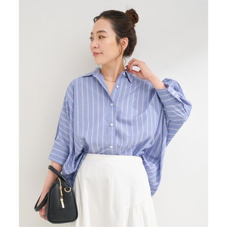 ハリのある素材でシルエットが決まりやすく、膨らみのある形で体型カバーする身体から離れたシルエットが魅力。タックを入れて丸みを出しながら袖口に向かってすぼまるフォルムで、肘が隠れるハーフスリーブが落ち着いた印象になります。爽やかなカラーの無地/ストライプ柄の展開でご用意しております。