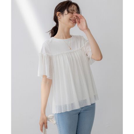 ■デザイン・プリーツ部分にギャザーを寄せてふんわり華やかなデザイン。・二の腕を優しくカバーする5分袖。・身頃はプリーツ素材+カットソー素材の2重仕立てで透け過ぎない構造に。