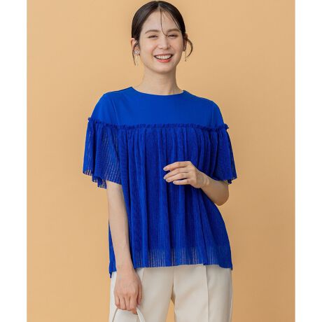 ■デザイン・プリーツ部分にギャザーを寄せてふんわり華やかなデザイン。・二の腕を優しくカバーする5分袖。・身頃はプリーツ素材+カットソー素材の2重仕立てで透け過ぎない構造に。