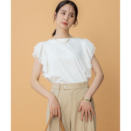 【スタッフコメント】▼身長158cm|着用サイズ2 (通常着用サイズ2)つるっとした身頃の素材感と袖のフリルデザインが大人フェミニンな上品カットソー。着心地も抜群なオンオフ問わず着用いただける万能な1枚です。