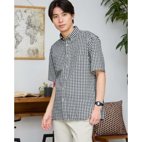 ボタンダウン襟の大柄ギンガムチェックシャツです。部分的にサッカー組織で織った生地は、肌離れがよくさらっとした着心地が特徴です。単色チェックはすっきりとした印象を演出します。