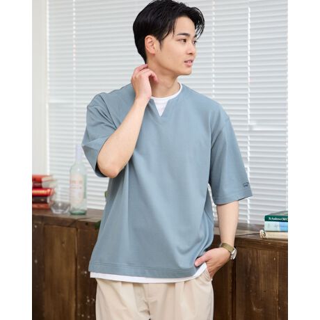 表情のある鹿の子素材を使用したレイヤードTシャツです。襟・裾から覗く天竺地が重ね着しているように演出します。ややゆったりとしたリラックスシルエットです。