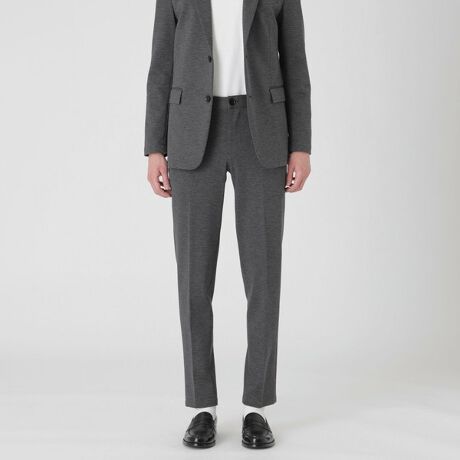 ハイゲージストレッチジャージー素材を使用したトラウザーズです。シャープな印象を持たせる細身のシルエットながらも、ウエスト部分にはゴムシャーリングを施している為、快適な履き心地でビジネスからカジュアルまで幅広く活躍するベーシックなデザインです。