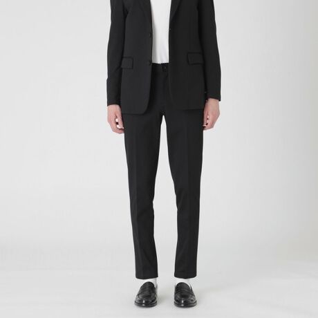 ハイゲージストレッチジャージー素材を使用したトラウザーズです。シャープな印象を持たせる細身のシルエットながらも、ウエスト部分にはゴムシャーリングを施している為、快適な履き心地でビジネスからカジュアルまで幅広く活躍するベーシックなデザインです。