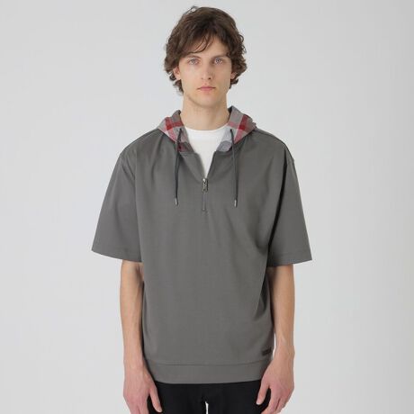 フードにクレストブリッジチェックをあしらった半袖パーカー。フロント部分はハーフジップデザインにする事で、スポーティーなトレンド感あるデザインに。シルエットは、ややゆったりとしたリラックスシルエットを採用。夏のスタイリングにアクセントとして映えるデザインの一着です。
