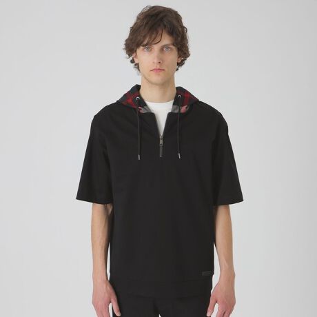 フードにクレストブリッジチェックをあしらった半袖パーカー。フロント部分はハーフジップデザインにする事で、スポーティーなトレンド感あるデザインに。シルエットは、ややゆったりとしたリラックスシルエットを採用。夏のスタイリングにアクセントとして映えるデザインの一着です。