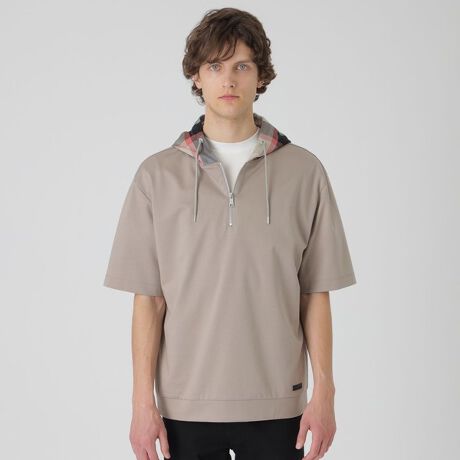 フードにクレストブリッジチェックをあしらった半袖パーカー。フロント部分はハーフジップデザインにする事で、スポーティーなトレンド感あるデザインに。シルエットは、ややゆったりとしたリラックスシルエットを採用。夏のスタイリングにアクセントとして映えるデザインの一着です。
