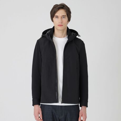 異なる素材を組み合わせたハイブリッドデザインのスポーツパーカーです。マットな質感のナイロンタッサーとストレッチダンボールニット素材をミックスし、素材の組み合わせがもたらす高級感と着心地の良さが特徴です。また、フード取り外しが可能な2WAY仕様で、スタンドブルゾンとしても着用が可能です。