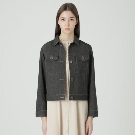 [型番:56F01557__]◆ショート丈デニムジャケット短めな着丈がポイントのデニムジャケットです。ポリエステルのデニムライク素材を使用しました。ショート丈デザインなのでウエスト位置が高く見え、スタイルアップが叶います。季節の変わり目のスタイリングに活躍する、便利なアイテムです。※展開店舗については予告なく変更になる場合がございます。