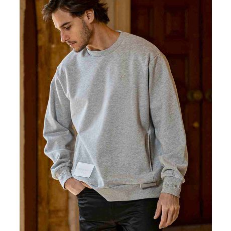 フェイクレザーに箔押しでブランドロゴを刻んだオリジナルのパッチがアクセントのクルーネックトレーナー。