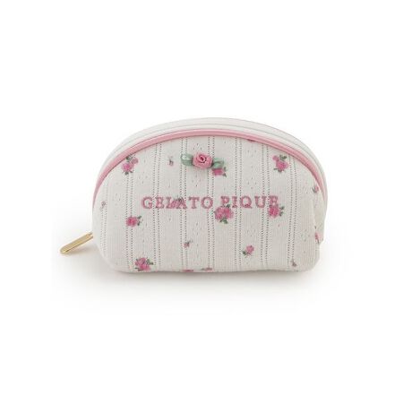 トレンドのリトルローズ柄のルームウェアと連動した雑貨シリーズです。ウェアとお揃いのリトルローズ柄針抜きカットソーを使用した、半月フォルムのミニポーチ。バラのリボンとロゴ刺繍をワンポイントであしらいました。片手で収まる小さめサイズなので、リップやファンデーション等をミニバッグで持ち歩きたいときにも便利。同シリーズのウェアや雑貨とコーディネートしたり、ギフトにもおすすめのアイテムです。