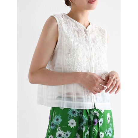 コード刺繍×チェック柄が目を惹くデザインジレ。