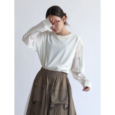 身頃には滑らかな肌心地の混紡素材を、ワッフル生地を部分使いし、さらに袖はほのかなシアー感のあるレーヨン混素材を使用。
