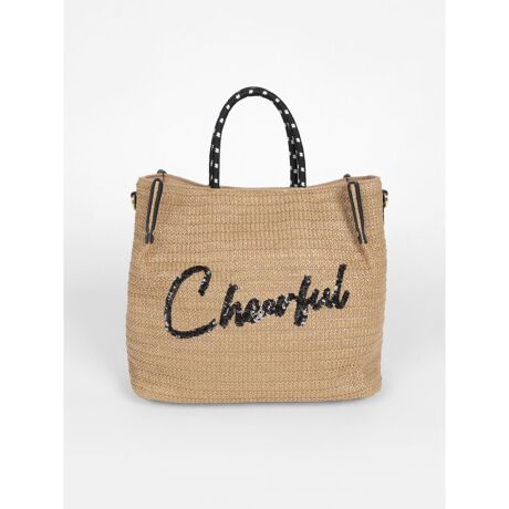 シーズンムード高まる雑材素材と、スパンコールロゴの掛け合わせが気分高まるバッグ。