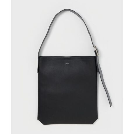 幅広のレザーストラップを通し、長さの調節を可能にするバックルをつけた大型のバッグ。
