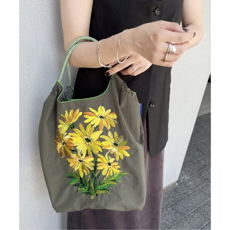 TOLIGHTデザイナー青山氏のドローイングのフラワー刺繍をBall&Chainの耐久性、撥水性に優れた厚手のポリエステル素材のバッグへ施すことで、高級感がありデザイン性の高いショッピングバッグに。