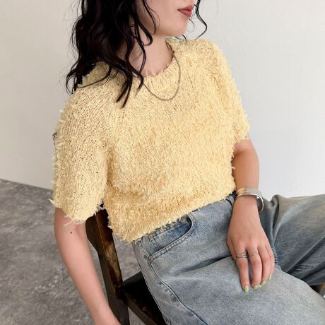・トレンド感のある異素材ミックスが魅力のチュールテープ半袖ニットプルオーバーです