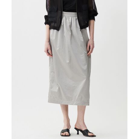 ■デザインタックとギャザーが効いたコクーンスカートです。大人の女性らしい程よいメタリック素材をきれい目に落とし込んだデザイン。シンプルなTシャツからクロップドシャツ合わせなど様々なスタイリングが叶います。きちんとした場面でもカジュアルな場面でもシーンレスに活躍するアイテムです。