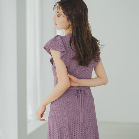 クロシェ編み風の透かし柄で、涼やかな抜け感をプラスしたニットワンピース。