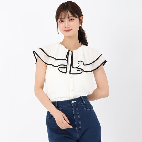 フリル襟で顔まわり華やぐ、ドビードットブラウス