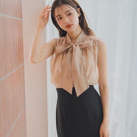 顔まわりを華やかに彩る大きめのリボンタイが主役のノースリーブブラウス。