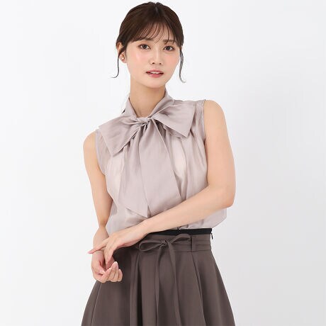 顔まわりを華やかに彩る大きめのリボンタイが主役のノースリーブブラウス。