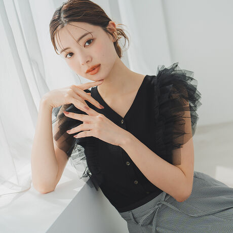 肩のフリルチュールが甘さをプラスするニットトップス。前後どちらでも着用可能な2WAYデザインでコーディネートの幅も広がります。キレイめにもカジュアルにも馴染みやすく、大活躍の1着です。■fabric透け感[無し]裏地[無し]伸縮性[有り]生地の厚さ[普通]