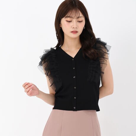 肩のフリルチュールが甘さをプラスするニットトップス。前後どちらでも着用可能な2WAYデザインでコーディネートの幅も広がります。キレイめにもカジュアルにも馴染みやすく、大活躍の1着です。■fabric透け感[無し]裏地[無し]伸縮性[有り]生地の厚さ[普通]