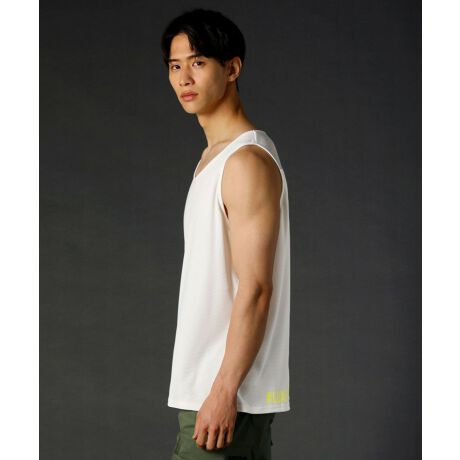 カラーはホワイト生地とブラック生地で、それぞれ裾のプリントカラーを2パターンずつの計4カラーでご用意しました。WHITE-A【プリントカラー:ブラック】、WHITE-B【プリントカラー:イエロー】と、BLACK-A【プリントカラー:ホワイト】、BLACK-B【プリントカラー:グリーン】です。スキニーパンツやショートパンツ、ジョガーパンツにさらっと合わせるだけでも夏っぽくかっこよく決まるタンクトップ。インナーとして着用し、裾のプリントを見せるようにレイヤードしていただくのもおすすめです。