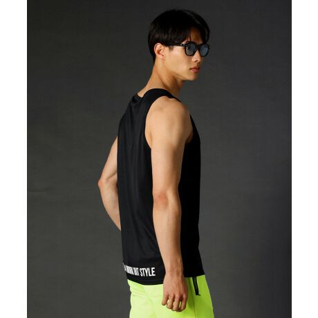 カラーはホワイト生地とブラック生地で、それぞれ裾のプリントカラーを2パターンずつの計4カラーでご用意しました。WHITE-A【プリントカラー:ブラック】、WHITE-B【プリントカラー:イエロー】と、BLACK-A【プリントカラー:ホワイト】、BLACK-B【プリントカラー:グリーン】です。スキニーパンツやショートパンツ、ジョガーパンツにさらっと合わせるだけでも夏っぽくかっこよく決まるタンクトップ。インナーとして着用し、裾のプリントを見せるようにレイヤードしていただくのもおすすめです。