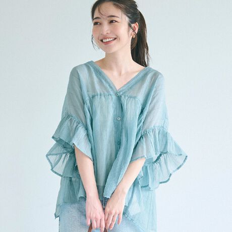繊細な透け感と華やかな袖フリルが魅力のシアーブラウス
