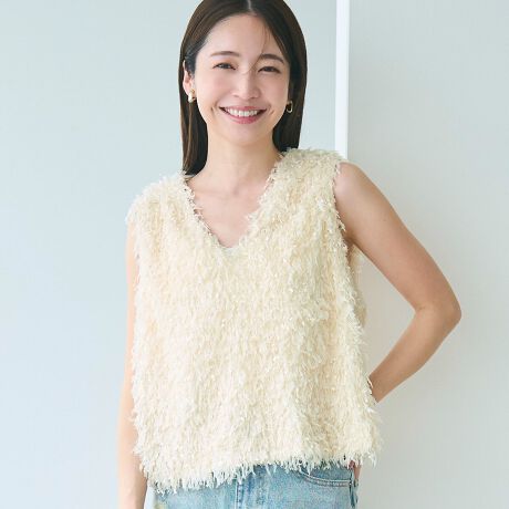 軽やかなシャギー素材が、夏の装いにやさしい表情を添えるベスト。