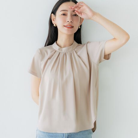 顔まわりをすっきり見せてくれるスタンドカラーに、フロントの繊細なタックが程よいアクセント。