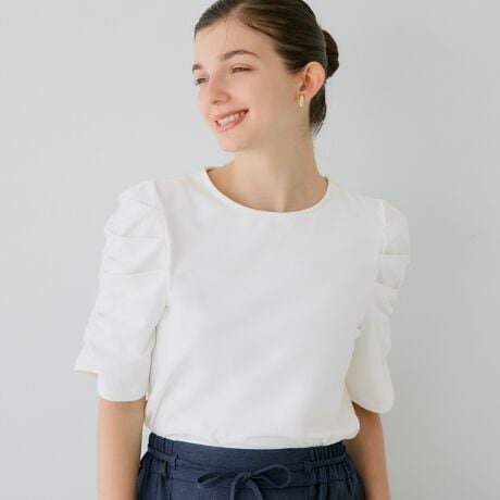 袖にたっぷりと施したギャザーが、程よく立体感を生むフェミニンなデザイン。