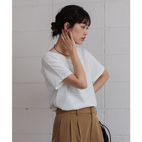 アームホールがないのでスッキリと脇周りもストレスフリー。Vネックでデコルテ周りもスッキリとカバーアップ!夏に大活躍の1枚です。袖口に艶めくオリジナル刻印のチャームもポイント