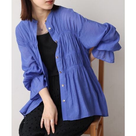 上品なツヤ感が魅力の、ギャザー付きブラウス。胸元のギャザーと袖に施したギャザーが立体感を演出し1枚で着映えするデザイン。