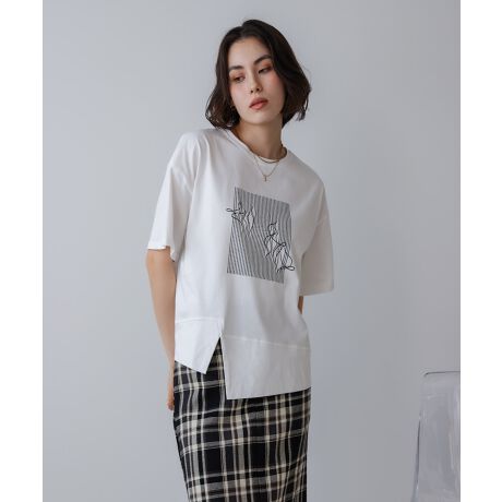 まず目を引くのは、アートなプリントデザイン。モノトーンでシンプル。品の良さを感じさせる仕上がりです。さらに、アシンメトリーなカッティングが、シンプルながらも個性的なシルエットを演出。裾にさりげなく入ったスリットは、動きやすさだけでなく、全体のバランスを美しくまとめています。