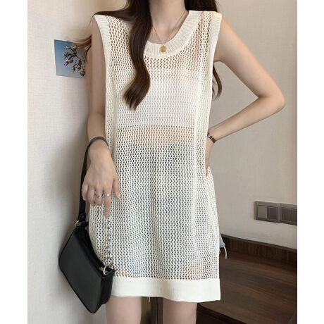 メッシュ素材が涼し気な印象を与える、夏にぴったりのノースリーブニットワンピース