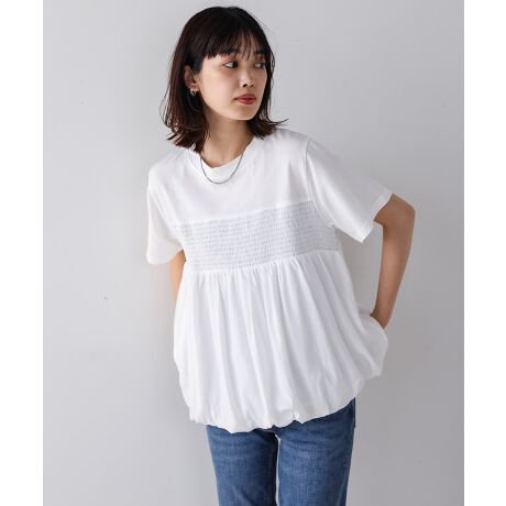 にバルーンのような丸みをもたせたシルエットが特徴。胸元にギャザーを施し裾部分はソフトな質感の素材を使用することで、大きすぎない膨らみが着るだけでこなれた印象になります。どんなボトムスとも相性よく、カジュアルにもきれいめにも対応できるトップスです。軽やかなラインが視線を集め、気になる部分を隠しつつ華やかなコーデが完成します。