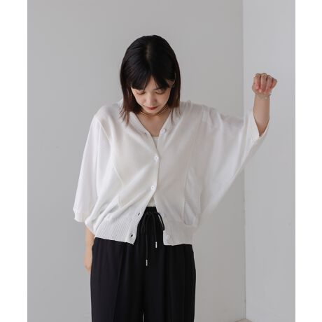 袖がチュールドッキングになった異素材ミックスが魅力のドルマンカーディガン。袖部分はチュールと布帛が二重になっているので透け感もなく安心。ドルマンスリーブでVネックデザインで顔まわりをすっきり見せつつ、ゆったりとしたシルエットがリラクシーな印象に。
