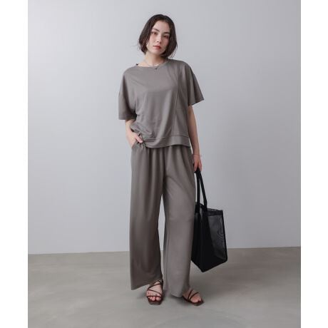 くすみカラーの大人のセットアップ。まだまだ残暑が厳しい中、さらっと着られるセットアップがおすすめ!