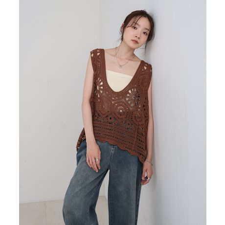 長いシーズン楽しんでいただけるさらっとお召し頂きやすい細番手の糸で編み上げたクロシェベスト!ゴワゴワ感が無いのでストレスフリーな肌触りです。繊細な編地の為、引っ掛かけには十分ご注意ください。
