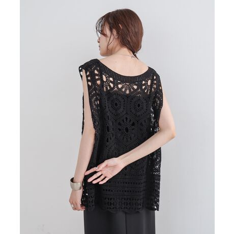 長いシーズン楽しんでいただけるさらっとお召し頂きやすい細番手の糸で編み上げたクロシェベスト!ゴワゴワ感が無いのでストレスフリーな肌触りです。繊細な編地の為、引っ掛かけには十分ご注意ください。