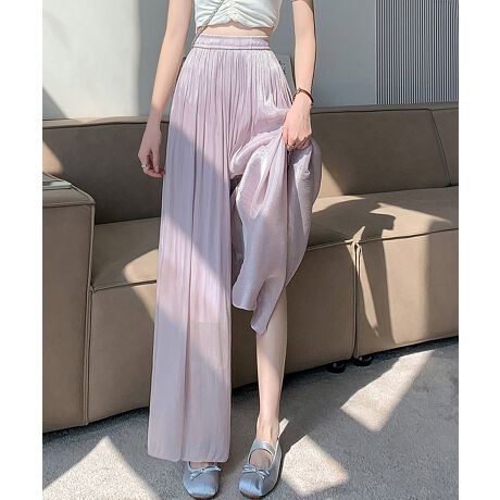 春夏に映える、なめらかな光沢感が魅力のシアーワイドパンツ。