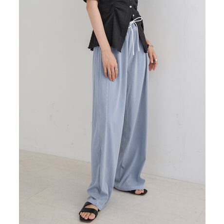 デニム風のルックスなのに、軽くて柔らかいナイロン×再生繊維素材で仕上げた、リラックス感たっぷりのイージーパンツ。しなやかな落ち感とさらっとした肌触りが特徴で、暑い季節も快適に過ごせます。ウエストはゴム仕様&白い紐がアクセントに。ラフに穿けるのに、だらしなく見えない絶妙バランスが魅力です。