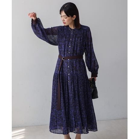 一枚でさまになるBou Jeloudのワンピース。シフォンジャガードの透け感のある生地で仕上げて、ボヘミアンでフェミニンな雰囲気に仕上げました。裾に細かなプリーツを入れて、歩くたびに裾がドラマティックで、軽やかなワンピースです。着脱は、フロントシャツボタン開きで、羽織としてもご使用頂けます。身頃は裏地ありで、透け感を気にせずに着用頂けます。袖はシアー感を残して、軽さを出しました。別ベルト付きで、高めの位置のループにしているので、腰高効果。