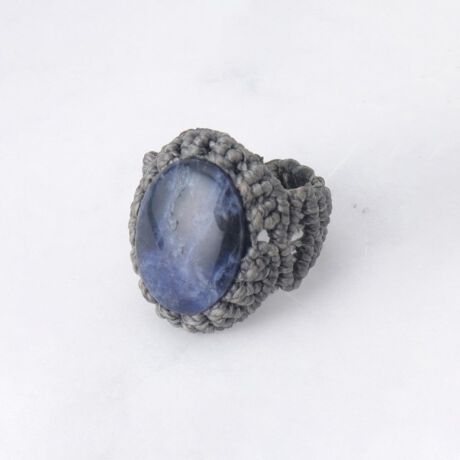 天然石ラピスラズリにカボション加工を施し石を覆うように編み込んでおりカレッジリング風のシルエットに仕上がってます。