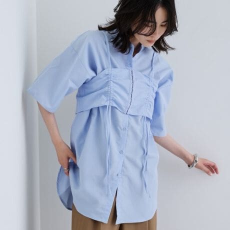 ビスチェ付きの半袖シャツは、モードとカジュアルを兼ね備えたデザインが特徴。