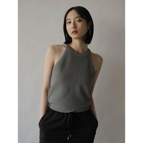 肩や顔周りを華奢みせしてくれる、アメスリデザインがポイントのニットタンクトップ。